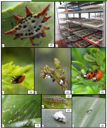 Figura 2. Artrópodos depredadores en aguacate y mandarina en el Valle de Cañete: a) G. cancriformis; b) Crianza de ácaros depredadores A. chungas y N. californicus, Fundo Lorca; c) C. sanguinea depredando a Aphis sp.; d) Larvas de S. rubicundus en brotes de A. horrida afectados por Aphis sp.; e) Adultos de H. axyridis copulando; f) Huevos de Chrysopidae; g) Larva de C. cincta en mandarina; h) Larva de C. cincta en aguacate; i) C. similis.