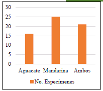 De acuerdo con los resultados, se encontró ocho órdenes, representados por 17 familias, 23 especies, con un total de 62 especímenes colectados. Las especies más abundantes fueron, de insectos, Ceraeochrysa cincta (Schneider, 1851) (Neuroptera: Chrysopidae), con 13 especímenes colectados en aguacate y mandarina, seguida por Harmonia axyridis Pallas, 1773 (Coleoptera: