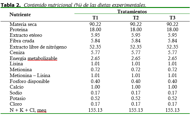 La composición química de las dietas utilizadas en el presente estudio se presenta en el Tabla 2.