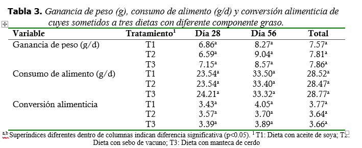 En general, los resultados corroboran lo hallado en estudios en cuyes empleando manteca de cerdo y aceite de soya donde no se obtuvieron diferencias significativas entre tratamientos (Seminario, 1971; Contreras, 2009); sin embargo, en el estudio de Visaga (2009), la inclusión de aceite de soya en la dieta produjo mejores conversiones alimenticias en cuyes en la etapa de engorde.