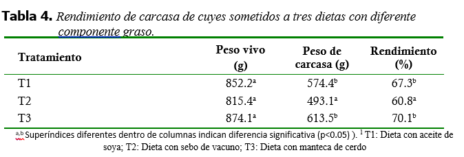 El peso vivo final, peso de la carcasa y rendimiento de carcasa se presenta en el Tabla 4. Se obtuvo menor peso de carcasa y rendimiento de carcasa en los animales alimentados con inclusión de sebo de vacuno (p<0.05). Por otro lado, los rendimientos de carcasa obtenidos son menores a otros estudios en cuyes (Morales et al., 2011; Camino e Hidalgo, 2014), debido posiblemente al empleo de cuyes hembras.