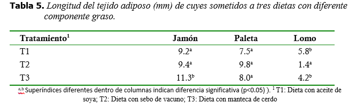 La longitud del tejido adiposo se presenta en el Tabla 5, donde se observa una mayor longitud en el jamón del tratamiento con manteca de cerdo (p<0.05). En la paleta no hubo diferencias y fue menor en el lomo cuando la dieta contenía sebo de vacuno (p<0.05. Los resultados indican que la acumulación de grasa corporal es menor en animales alimentados con una dieta enriquecida con ácidos grasos poliinsaturados como es el caso de los animales que recibieron aceite de soya.