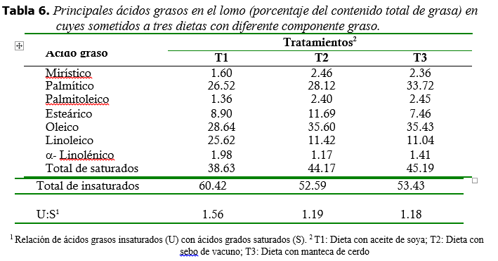 Los resultados muestran que los cuyes que recibieron inclusión de aceite de soya acumularon una menor cantidad de ácidos grasos saturados que aquellos que recibieron la inclusión de sebo de vacuno o manteca de cerdo; aun teniendo en cuenta que todos los tratamientos tuvieron el mismo nivel de energía digestible durante todo el periodo experimental; corroborándose la información mostrada en cerdos por(Valaja y Siljander-Rasi, (2001), en pollos (López Ferrer et al., 1999; Bou et al., 2005) y patos (Scheavoni et al., 2004), quienes manifiestan que existe una relación directa entre el perfil de ácidos grasos de la dieta y el perfil de ácidos grasos de la carne, debido a la absorción y posterior deposición de cada ácido graso.