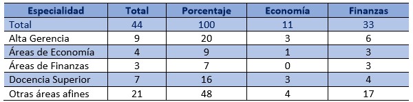Respecto al nivel máximo de estudio alcanzado, el 18% de los graduados en Economía poseen maestrías y un 10% postgrados. En la carrera de Finanzas y Banca un 28% respondió tener maestrías y un 10% postgrado. La tabla 1 refleja el tipo de estudio de postgrado realizado por los graduados, el 20% de los graduados tiene especialidades en alta gerencia, un 16% en el área de docencia superior y un 48% con estudios en áreas afines.