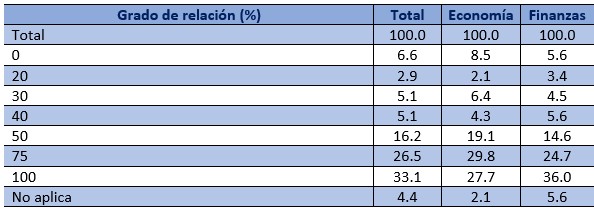 Uno de los aspectos más importantes fue el grado de relación entre la formación profesional que recibieron los egresados durante sus estudios y las habilidades que su trabajo actual les exige. En la tabla 3 se observa que el 59.6% de los encuestados manifestó que su trabajo actual está relacionado en un 75% a 100% con su formación profesional. Estas proporciones no difieren mucho entre economistas (57.5%) y financistas (60.7%). Lo anterior sugiere un alto grado de relación entre la formación que reciben los graduados y las exigencias del mercado laboral.