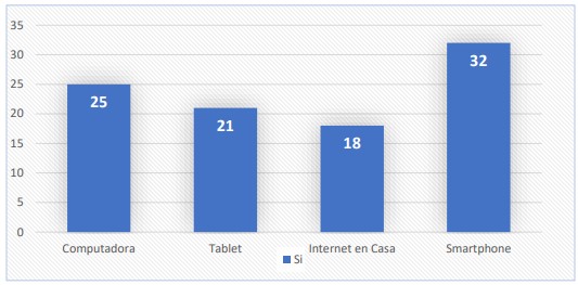 Los resultados que se presentan en la figura 1 revelan que: el 65.8% de los estudiantes cuenta con computadora, el 55.3% posee tableta, el 47.4% tiene acceso a Internet en sus casas y el 84.2% dispone de smartphone. Llama poderosamente la atención, que la mayoría de los participantes son usuarios de smartphones (32 de 38 estudiantes), lo cual podría ser