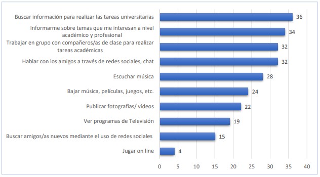 (36) la utiliza para buscar información y realizar tareas universitarias; el 89.5% la emplea para informarse acerca de temas que le interesan; el 84.2% la utiliza para trabajar en grupo con compañeros de clase y hablar con amigos a través de redes sociales. En menor medida