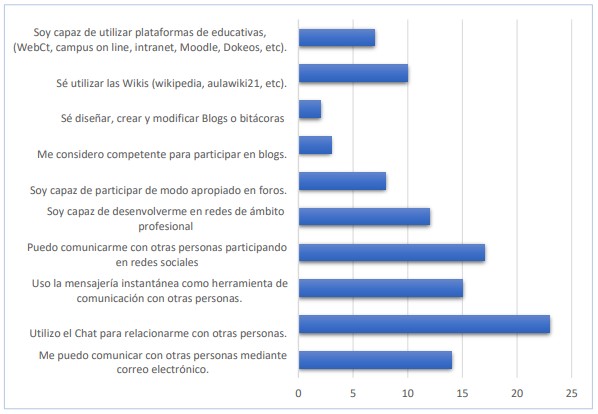 Tomando como base los resultados de los aspectos donde los encuestados se sienten muy competentes (4 en la escala previamente establecida), la figura 3 evidencia que: el 18.4% utiliza plataformas educativas; el 26,3% usa las Wikis; el 5.3% diseña blogs; el 7.9% se siente competente para participar en blogs; el 21% participa apropiadamente en foros; el 31.6% es capaz de desenvolverse en redes profesionales; el 44.7% puede comunicarse a través de redes sociales; el 39.5% usa la mensajería instantánea para comunicarse; el 60.5% utiliza el chat para relacionarse con otras personas y el 36.8% se comunica con otras