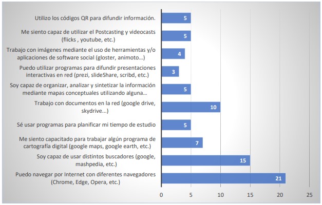 indicando los mayores valores del 55.6% en navegar por internet utilizando diferentes navegadores, lo cual concuerda con Vázquez, Reyes, Colmenares y López (2017), cuando determinan que la navegación por internet es el aspecto que más se destaca en la búsqueda y tratamiento de la información. Los resultados salieron muy bajos en el uso de programas para presentaciones interactivas como Prezi o Slideshare y en trabajar imágenes con herramientas de software social (7.9 y 10.5% respectivamente). Resalta también el hecho de que los estudiantes no son capaces de analizar y sintetizar información en mapas conceptuales utilizando alguna aplicación tecnológica, en el que solo se obtuvo un 13%.