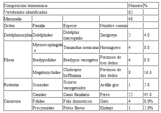 Después del perro doméstico (canis familiaris), los más frecuentemente atropellados fueron: el perezoso de dos dedos (Choloepus hoffmanni), seguido del oso hormiguero (Tamandua mexicana) y el perezoso de tres dedos (Bradypus variegatus).