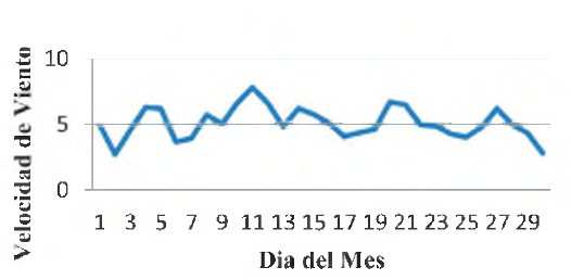 En figura 6 esta rosa de magnitudes se puede observar la cantidad de veces que una velocidad se repite durante un mes, la velocidad media es 5.1 m/s.