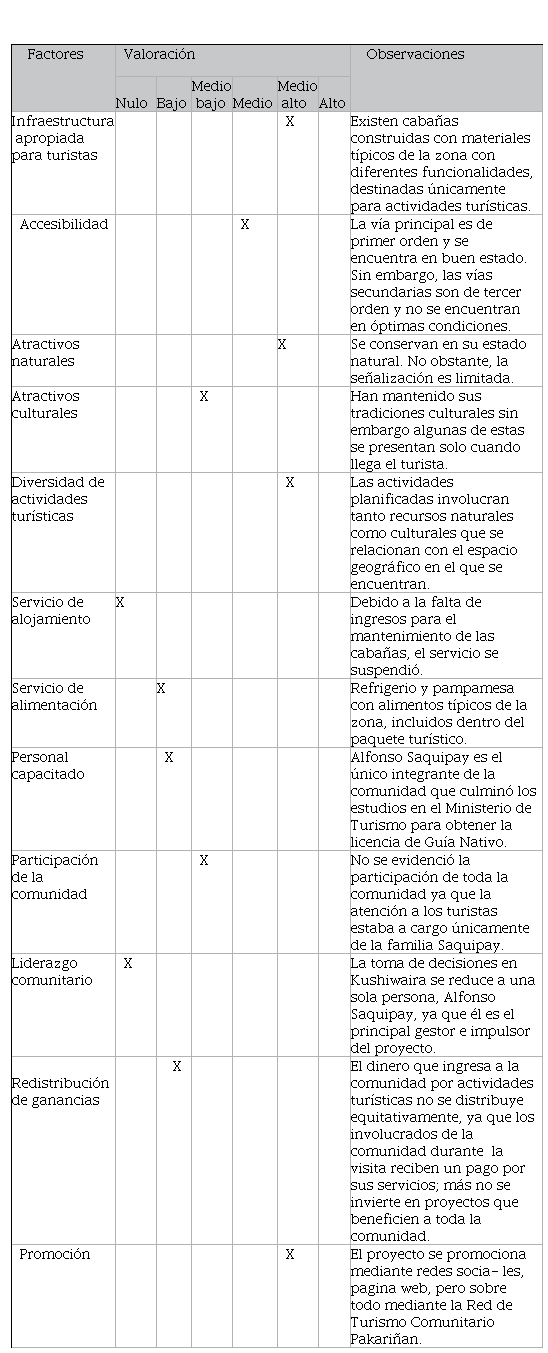 El análisis efectuado del presente caso de turismo comunitario en la provincia del Azuay da como resultado que Kushiwaira no se encuentra dentro del concepto de turismo comunitario, ya que no cumple con los factores principales para identificarlo como tal. La FEPTCE reconoce tres gestiones de turismo comunitario: participación de una sola comunidad, dos o más comunidades con un solo producto turístico, y la participación de un grupo familiar nativo que cuente con el aval de la comunidad a la que pertenece (Rodas et al., 2015). Este proyecto comunitario podría identificarse como la tercera forma de gestión establecida por la FEPTCE, sin embargo, se debe tener en cuenta que la propiedad donde se desarrollan las actividades no pertenece al colectivo comunitario, es decir es de propiedad privada perteneciente a Alfonso Saquipay.