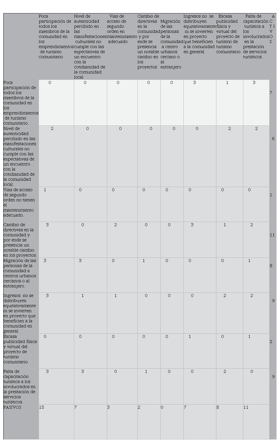 Los problemas identificados a través de la matriz de Vester (Tabla 2) que limitan el desarrollo del turismo comunitario son: