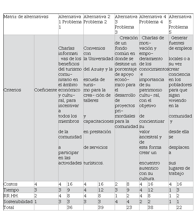La matriz de alternativas (Tabla 3) nos da como resultado que nuestras opciones para mejorar las debilidades o problemas que la comunidad presenta son la creación de talleres y capacitaciones en prestación de servicios turísticos; Charlas de motivación y empoderamiento de los conocimientos e importancia de su patrimonio cultural, con el objetivo de concientizar su valor ancestral y de esta forma crear un encuentro auténtico con su cultura, y por último, charlas informativas de los beneficios del turismo comunitario en el ámbito económico y cultural, para incentivar a todos los miembros de la comunidad a participar en las actividades.