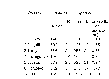 La superficie bajo riego de la acequia es de 1232 ha y el número de agricultores catastrados que hacen uso de estas aguas asciende a 1557. El mayor número de usuarios y área de riego se sitúan en los óvalos Tunga y Lozada; mientras que en los óvalos Pulluco y Cachiguayco, al tener influencia de la expansión urbana, registran cifras inferiores (ver Tabla 1).