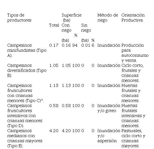 Los campesinos con menor acceso a la tierra y que poseen predios menores a 0.5 ha son catalogados como “minifundistas” (Tipo A). También existen propiedades con extensiones de entre 0.5 y 2 ha, las cuales pertenecen a agricultores con orientación productiva diversificada y producción frutícola (Tipos B, C y D). Finalmente, existen productores con mayor acceso a la tierra (2-5 ha), que la valorizan principalmente con pastizales para la crianza de animales mayores y cultivos para la venta (Tipo E). La técnica de riego predominante es por inundación; sin embargo, existen explotaciones que usan sistemas de riego por aspersión y goteo, en productores con mayor acceso a la tierra o que han intensificado la producción frutícola (Tabla 2).