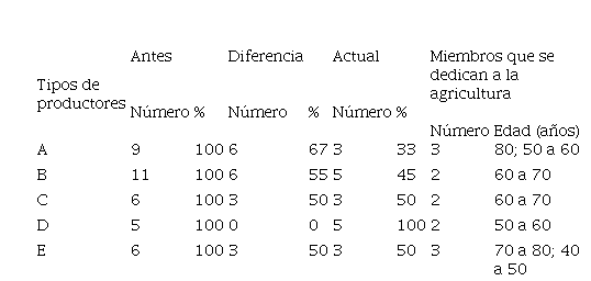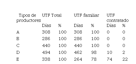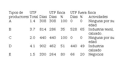 Mientras los campesinos con mayor edad destinan la totalidad de la mano de obra para la producción predial (Tipos A y C), los productores con mayor disponibilidad de fuerza de trabajo (Tipos B y D), cuyos hijos son todavía jóvenes, se insertan en actividades no agrícolas como la industria textil, calzado o pequeños negocios (Tabla 3). Caso particular constituyen los agricultores con mayor acceso a la tierra (Tipo E) que, a pesar de tener limitada mano de obra, destinan un apreciable porcentaje de tiempo para la gestión de pequeños negocios.