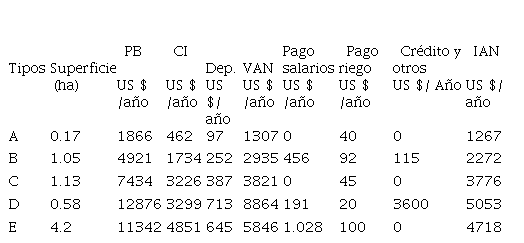 El ingreso agropecuario de un campesino se obtiene como resultado de la actividad agrícola de su explotación. En general, las remuneraciones de todos los tipos de productores son bajas, con un rango de entre US $ 1267 y US $ 5.000 por año (Tabla 6). Sin embargo, existen diferencias en términos de disponibilidad de tierra y orientación productiva. Los agricultores con más bajos ingresos son los minifundistas (Tipo A), pequeños campesinos diversificados (Tipo B) y fruticultores (Tipo C). En contraste, agricultores con mayor acceso a la tierra, que han especializado su producción, obtienen una mayor remuneración (Tipos D y E).