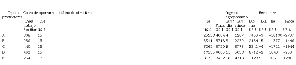 El excedente representa la ganancia resultante del trabajo en la finca. Para la mayoría de los campesinos, la labor invertida en el predio no permite obtener ganancias, situación que se agrava a medida que se reduce el tamaño de la explotación. En contraste, la tipología E, compuesta por agricultores con mayor acceso a la tierra y con orientación a la crianza de animales bovinos, constituye la única categoría que presenta excedentes, superando incluso en un 39% al valor promedio del costo de oportunidad en la zona (Tabla 7).
