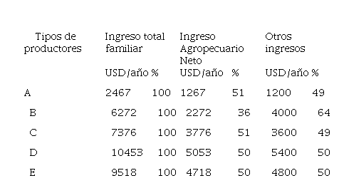 El ingreso generado por la actividad agropecuaria no satisface las necesidades familiares en la mayoría de los casos y, menos aún, permite realizar mejoras en la finca. Por tal motivo, la obtención de otros ingresos vinculados o no con la agricultura es inevitable para garantizar la manutención de la familia. Los principales rubros se sitúan en pensiones por jubilación, bono de desarrollo humano y pequeños negocios. Además, cuando se dispone de mano de obra familiar, con una mayor actividad laboral (Tipo B y D), se inserta en la industria textil, de calzado o trasporte menor. En todos los casos, el ingreso no agrícola puede representar alrededor del 50% del ingreso familiar total (Tabla 8).