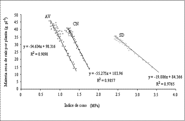 La MSR se vio afectada negativamente por la compactación del suelo. A medida que el IC aumentó, MSR disminuyó en el perfil del suelo (Figura 11). Para los tres tratamientos se detectaron diferencias significativas, ocho semanas después de la emergencia de plántulas (en la floración), en el promedio de los valores de MSR. El promedio más alto de MSR fueron para los tratamientos AV y CN (45.9 y 42.2 g planta-1, respectivamente), mientras que el valor más alto en SD fue de 37.0 g planta-1 (Tabla 6).