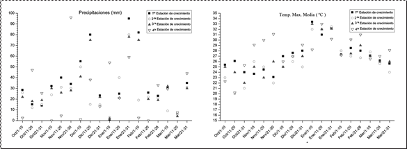 El w/w, promedio para los cuatro años de ensayo en el día de siembra fue del 18.6% del peso seco desde los 0 hasta los 150 mm de profundidad, 20% de 150 a 300 mm y 20.7% desde 300 hasta 450 mm. La precipitación total cada diez días y el promedio de temperaturas máximas del 1/10 al 31/03 para cada año se muestra en la Figura 8.