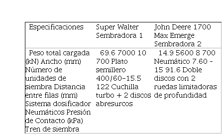 Ambos, el tractor y las dos sembradoras, son utilizados comúnmente por los productores del área de estudio. La sembradora 1 se utilizó en el tratamiento SD, y la sembradora 2 en CN y AV, de acuerdo con sus características (Fonterosa, 2012).