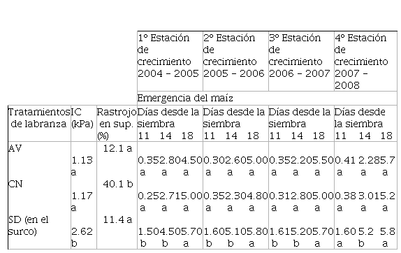 A pesar de las diferencias en la cobertura de rastrojo se encontró que, entre los tratamientos de labranza, la emergencia de las plántulas de maíz no se vio afectada.