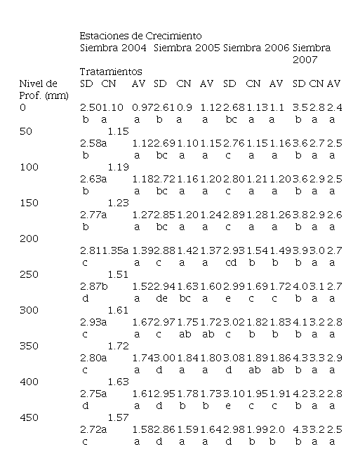 La respuesta del suelo al tráfico en las capas más profundas reveló, según lo indicado por el IC, un aumento en el rango de profundidad de 300 a 450 mm (valores máximos de cuatro años). Todos los valores de IC en el suelo bajo SD después del tráfico, para realizar la labor de siembra, fueron más altos que los valores medidos para CN y AV. Una razón importante para que el IC sea mayor en el suelo bajo SD es la baja compresibilidad de este suelo firme, como lo demuestran sus altos valores IC en comparación con los tratamientos de labranza. En el rango de 300 a 450 mm de profundidad, el promedio de IC en el tratamiento SD, fueron 2.80, 2.94, 3.05 y 4.22 MPa para la primera, segunda, tercera y cuarta estación de crecimiento respectivamente.