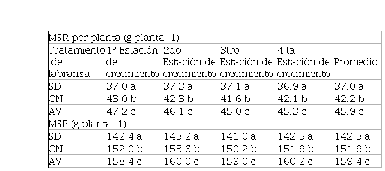 Para las cuatro estaciones de crecimiento, la MSP fue estadísticamente diferente para cada tratamiento. El promedio de la MSP fue 159.4 g planta-1 en AV, seguido por 151.9 g planta-1 en CN y 142.3 g planta-1 en SD.