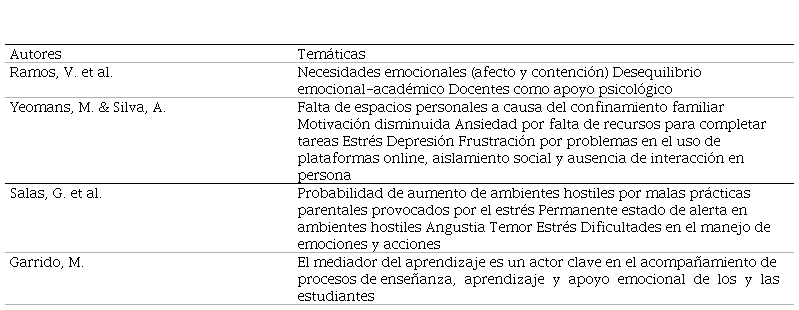 Respecto al Covid-19 como evento traumático asociado al temor en estudiantes chilenos, de las cuatro publicaciones, solo Salas et al. (2020) hacen referencia explícita del temor y, en el mismo artículo, se comenta sobre la posibilidad de que la hostilidad haya aumentado en aquellos hogares donde los padres sufren estrés; también refieren que los estudiantes son apoyados por sus docentes en el manejo de emociones y acciones. Garrido (2020), por su parte, también refiere que el docente es un actor clave en el apoyo emocional de los estudiantes, aun cuando requieren formación o capacitación en apoyo emocional sin mencionar el temor. En la misma línea, Yeomans & Silva (2020) presentan la depresión como un trastorno presente y que se podría acentuar en condiciones de confinamiento; la depresión puede asociarse a distintas emociones desagradables, entre ellas el temor, como causante o consecuencia (Fredrickson, 2000). Finalmente, Ramos et al. (2020) no se refieren directamente al temor o emociones desagradables, pero sí mencionan que existen necesidades emocionales de afecto y contención, desequilibrio académico emocional (siendo el apoyo emocional más relevante que el académico) y el rol del docente como apoyo psicológico permanente.