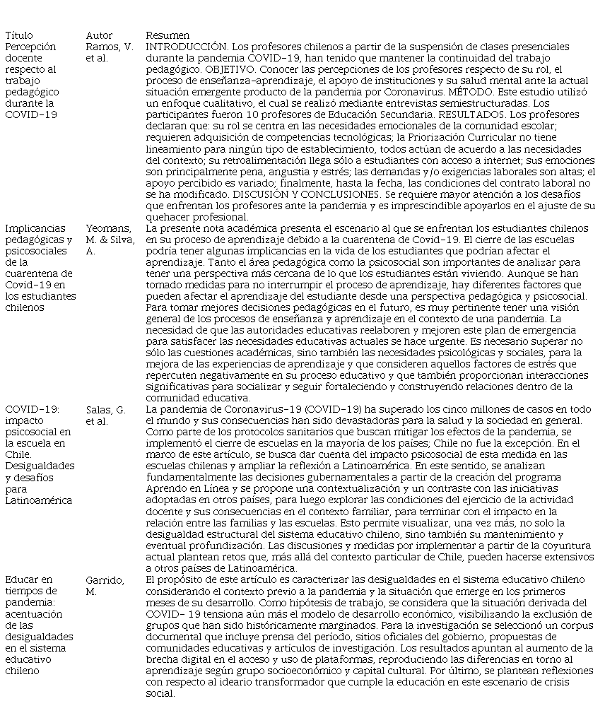 Finalmente, el cuarto estudio, “Educar en tiempos de pandemia: acentuación de las desigualdades en el sistema educativo chileno” (Garrido, 2020), tuvo como objetivo caracterizar las desigualdades en el sistema educativo chileno considerando el contexto previo a la pandemia y la situación que emerge en los primeros meses de su desarrollo. Dentro de los puntos principales abordados en este artículo se encuentra la tensión que ha tenido el modelo de desarrollo económico, así como la visualización de los grupos marginados en Chile en tiempos de COVID. Una de las debilidades que presenta esta publicación se relaciona con que todas las acciones realizadas por el gobierno son insuficientes, indicando que el modelo imperante en la sociedad actual no permite el desarrollo estructural de la igualdad. Dentro de los estudios futuros podría desarrollarse el impacto en los procesos de deserción académica en tiempos de pandemia y sobre la salud mental de los estudiantes chilenos.
