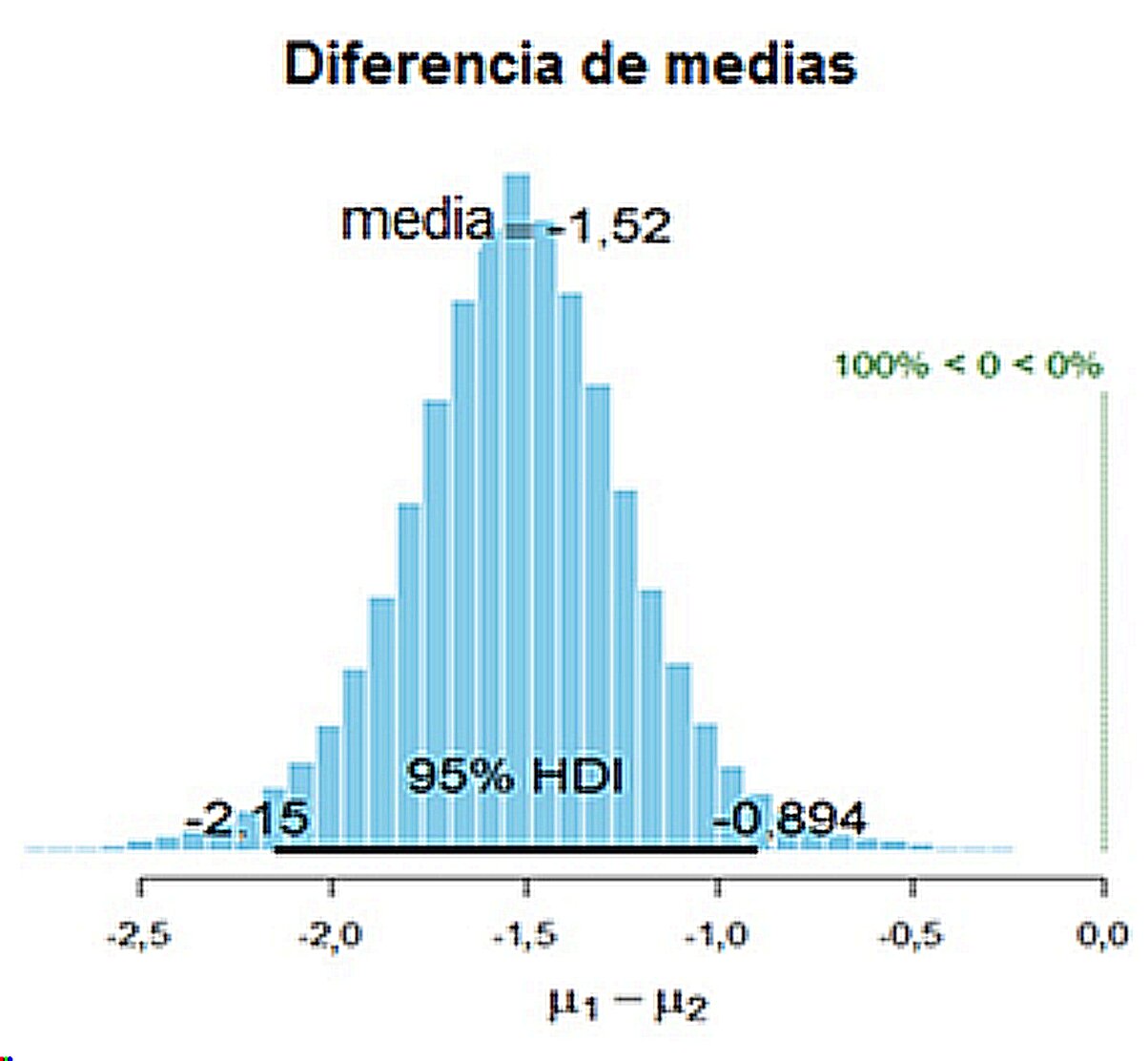 Representación gráfica de la diferencia de medias en la relación albúmina/globulina entre el grupo de animales positivos y negativos a las pruebas diagnósticas de paratuberculosis. La barra horizontal negra representa el 95% HDI (Highest Density Intervals) con sus intervalos de credibilidad bayesiano (ICB) 95% (2,15, 0,894), el ICB no contiene al cero; µ1: media del grupo 1 (positivos a las pruebas diagnósticas), µ2: media del grupo 2 (negativos a las pruebas diagnósticas). El 100% de los valores se encuentran a la izquierda del cero, demostrando una disminución significativa en la relación albúmina/globulina.