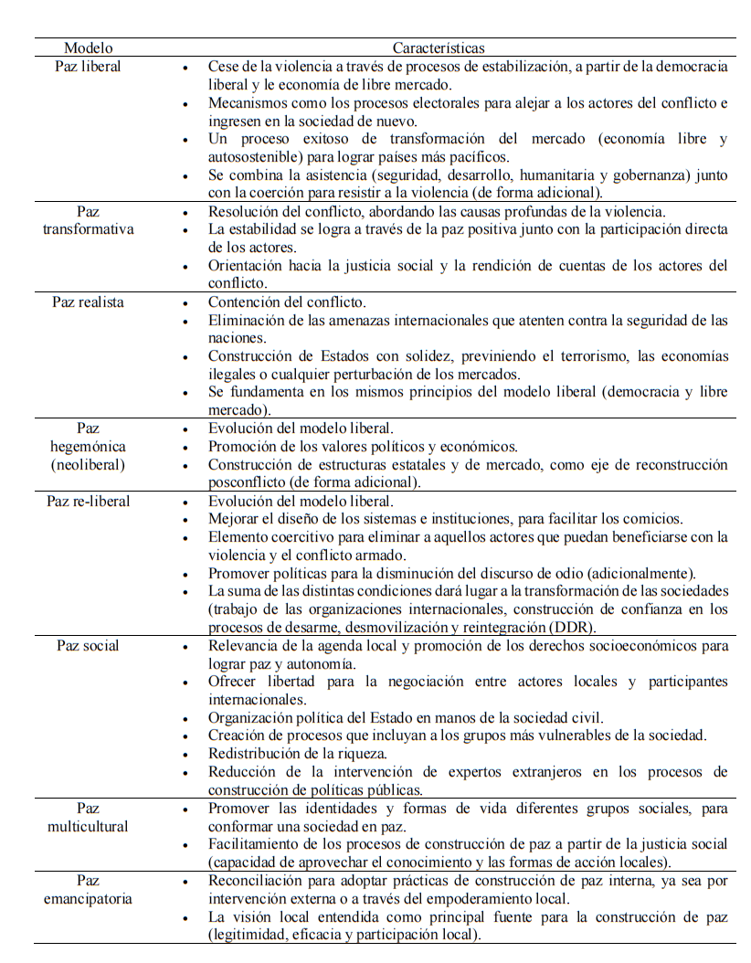 Debido a la multitud de estudios que sopesan distintas tipologías de paz, hemos resuelto analizar el trabajo de Wynter y Romero (2018), en el que se identifican las estructuras centrales de una clasificación de tipos de paz, en base a los análisis de diversas teorías de construcción de paz abordadas ampliamente por autores como Newman (2009) y Poole (2011). En la Tabla 1 se exponen los cinco modelos con sus respectivas características.