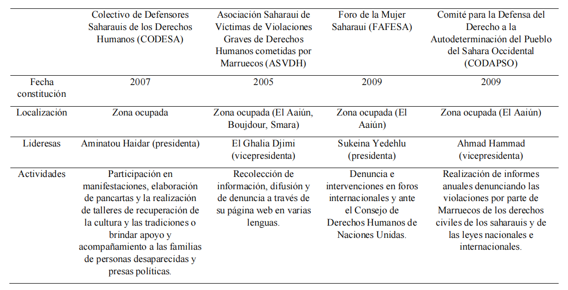 Dichas movilizaciones, se articulan y agrupan en base a la Coordinadora de Asociaciones y Comités Saharauis de Derechos Humanos. Las mujeres juegan un papel fundamental dentro de organizaciones de naturaleza no violenta, tanto en su militancia como en la fundación de las mismas. No obstante, se vuelve a hacer visible su ausencia en los espacios de representación institucional. Consideramos como necesario mencionar algunas de las organizaciones que forman parte de esta Coordinadora, como la Asociación Saharaui para la Protección y la Difusión de la Cultura y del Patrimonio, el Observatorio saharaui de la mujer y del niño, Centro saharaui para conservar la memoria colectiva o la Plataforma de Gdeim Izik. En la Tabla 2 resaltamos las organizaciones lideradas por mujeres en calidad de presidentas y vicepresidentas.