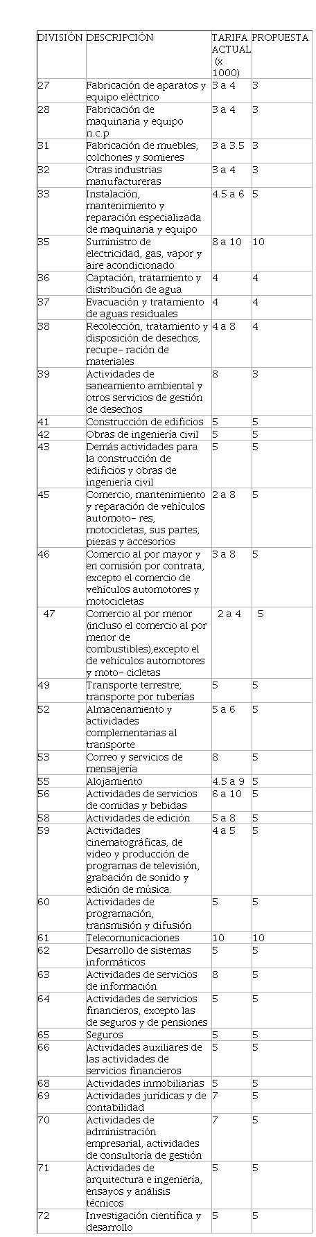 De esta manera, mediante la siguiente tabla, definida por los diferentes tipos de divisiones de actividades económicas principales se determina la tarifa actual y la propuesta de reforma para el artículo 107 del Acuerdo municipal 071 de 2013 de Santa Rosa de Cabal (Acuerdo 107 de 2013): Las tarifas del impuesto de industria y comercio según la actividad de acuerdo con la Clasificación Internacional Industrial Uniforme (CIIU) adoptada para Colombia por el DANE, son las siguientes:
