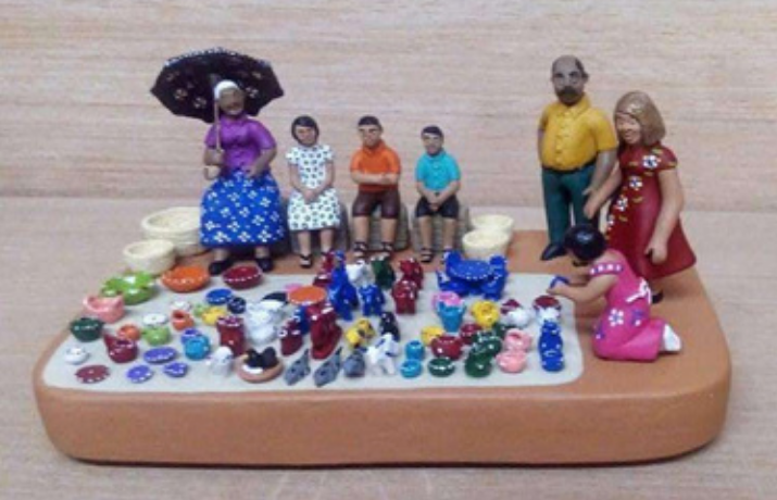 Quando eu tinha 8 anos de idade, já estava na escola. Eu chegava e já vinha pensando em brincar com barro e aí já comecei a vender algumas coisinhas dos meus brinquedos. Tinha meu irmão que também fazia os brinquedinhos, que é o José Antônio. Ele fazia uns cavalinhos e sempre ia à feira com papai para tomar conta dos brinquedinhos da gente para vender. Papai vendia numa banquinha e ele forrava um papelzinho no chão para colocar os brinquedinhos da gente para vender. Todos os irmãos faziam brinquedinhos.
