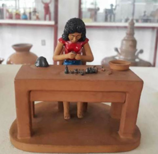 Na imagem abaixo, Marliete se autoretrata num momento de processo criativo em uma obra que está exposta no Museu do Barro[6], em Caruaru. Nos anos 1980, a mestra foi contratada pelo então presidente da Fundação de Cultura da cidade, Altair Porto, para produzir peças que ajudassem a contar a história da arte em barro e do agreste pernambucano. Durante quatro meses a produção da mestra foi voltada a reproduzir materialmente as subjetividades e vivências que fazem parte de seu trajeto antropológico e permeiam o seu imaginário. As obras passaram a compor a exposição permanente do museu. Isso reforça o que Nochlin (2016) comenta sobre a importância do papel das instituições seja para a visibilidade, quando permitem que as mulheres ocupem esses espaços, ou para a invisibilidade, quando ao menosprezarem a capacidade inventiva dessas mulheres baseados em estereótipos de gênero, negam-se a abrir espaço para as artesãs.