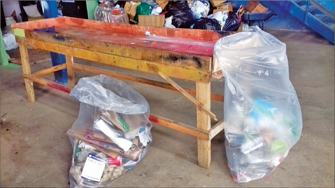 En lo referente a la operación de separación, ninguno de los CRRV estudiados utiliza equipos tecnológicos que aprovechen la diferencia en las propiedades físicas de los distintos materiales para su extracción de los residuos de entrada, la separación en todos los casos se realiza de manera completamente manual. Respecto a la superficie sobre la cual se realiza la clasificación de los residuos se encontró que en la mayoría de instalaciones esta operación se hace sobre mesas fijas (figura 3), pero también se encontraron casos en que se realiza la separación sobre el suelo y un CRRV, el número 10, en que se realiza sobre una banda transportadora (cuadro 3).