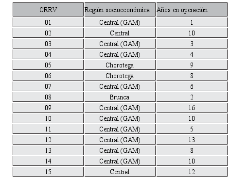 No se obtuvo autorización por parte de los municipios para nombrar explícitamente el cantón de los CRRV participantes del estudio, por lo cual se hará referencia a las instalaciones con un número, tal como aparece en el cuadro 1 junto con la región socioeconómica en que están ubicados y los años que llevan en operación.