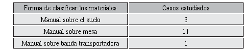 La clasificación manual sobre una superficie estática, suelo o mesa, es adecuada para procesar cantidades de residuos inferiores a las 2 toneladas por día, mientras que una banda transportadora de una sola línea permite aumentar el procesamiento al orden de 10 toneladas diarias [18]. Por lo tanto, la tecnología para clasificación con que cuentan los CRRV es adecuada para la cantidad de materiales procesados en un 87% de los casos.