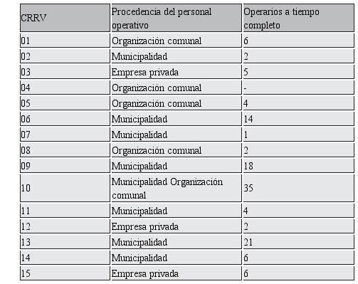 Los CRRV que dependen en gran medida de las actividades de clasificación manual son instalaciones intensivas en mano de obra [20]. Los CRRV municipales en Costa Rica son operados en algunos casos por personal contratado directamente por la municipalidad y en otras ocasiones por organizaciones comunales o empresas privadas con las que se establece un convenio. En el cuadro 4 se muestra la procedencia del personal operativo y la cantidad de trabajadores a tiempo completo con que cuentan las instalaciones. En algunas ocasiones los CRRV emplean personal temporal o voluntario, sin embargo, es difícil prever la disponibilidad de este personal [21], [22].