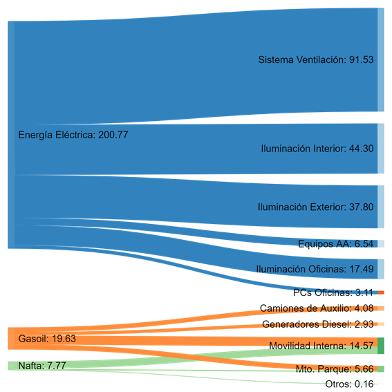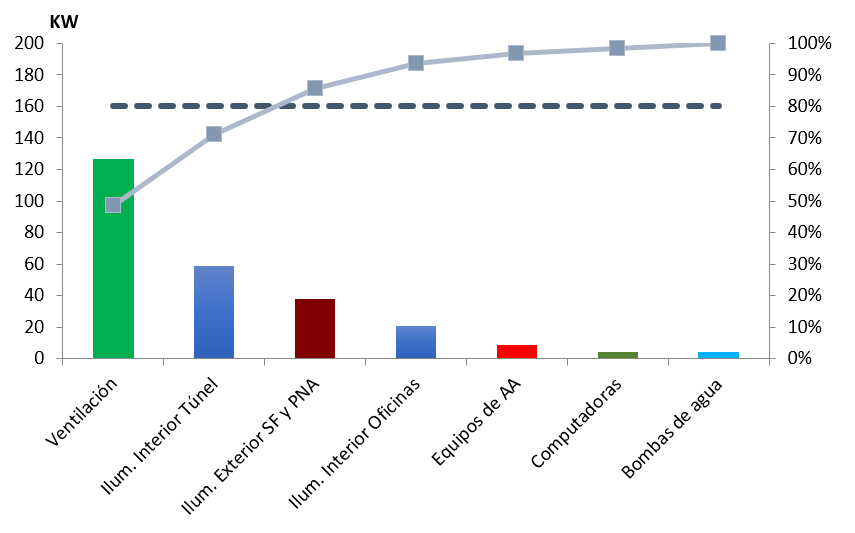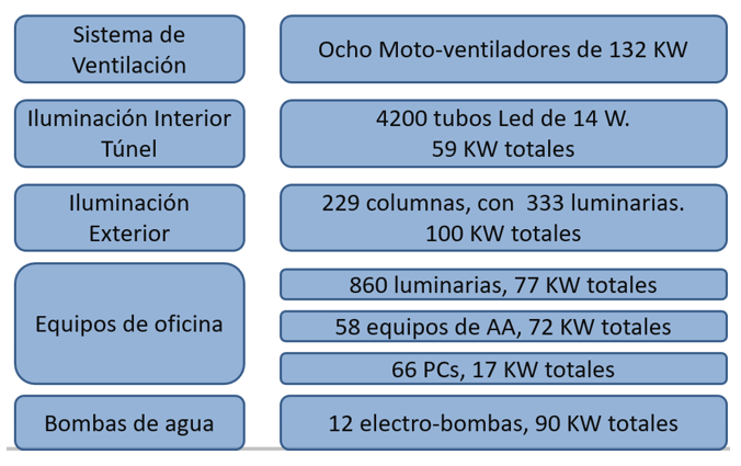 El análisis energético realizado en la primera etapa de este proyecto permitió conocer cómo se distribuye actualmente la matriz de consumo energético del túnel subfluvial. Se identificaron los sectores con más peso en dicha matriz.