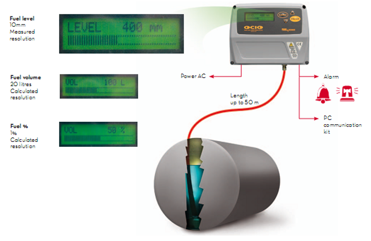 Se tercerizará la instalación de un Sistema de gestión de combustible compatible con los surtidores existentes (figura 15). El mismo constará de una sonda que mide el nivel dentro de los tanques, junto con una central que toma los datos, realiza un registro de las variaciones, permite programar alarmas y establecer un diálogo constante con una PC, pudiendo exportar los datos generados y/o comunicarlos a un SCADA.
