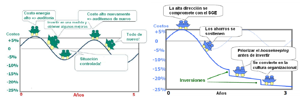 En la figura 1 se muestran los resultados en cuanto a reducción del consumo de una gestión no sistemática y una sistemática, mientras una es altamente variable la otra mantiene una performance positiva sostenida. (McKane, 2010),