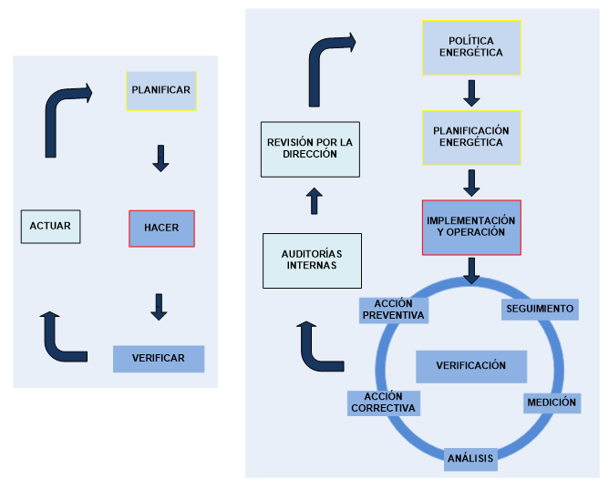 Para lograr esto, dicha norma se basa en el ciclo “Planificar – Hacer – Verificar – Actuar”, definido en la norma IRAM-ISO 9.001 sobre gestión de la calidad (ISO, 2008), adaptado en este caso para incorporar la gestión de la energía a las prácticas habituales de una organización, tal como se muestra en la figura 2.