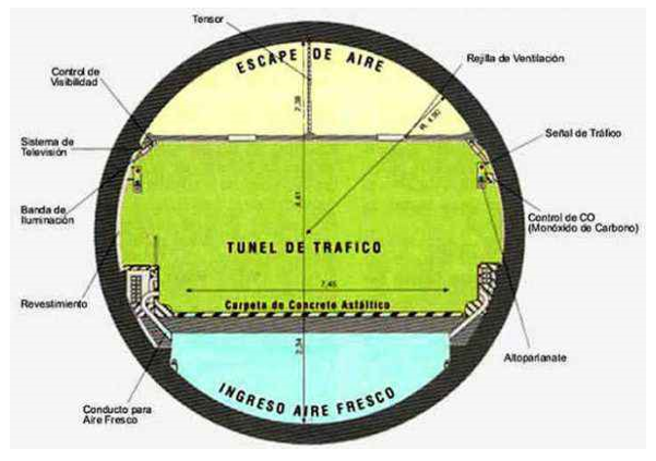 La figura 4 muestra el perfil de un tubo del túnel y como se distribuye el flujo de aire en su interior, además de otros sistemas ubicados en él.