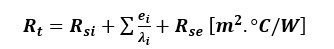 Si se tienen en cuenta los espesores de los diferentes componentes de la envolvente de un edificio, que a su vez tienen diferente conductividad térmica, se define la resistencia térmica total (Rt), que es una medida de la resistencia a la transferencia de calor bajo condiciones de flujo estacionario (Schokker, 2010), mediante la siguiente expresión:
