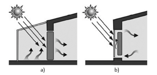 Especialmente en climas fríos se pueden utilizar espacios vidriados adosados (invernaderos) o muros termoconvectivos (muro Trombe), con el objetivo de potenciar el uso de la radiación solar directa en forma pasiva para calefaccionar la vivienda (Figura 9).