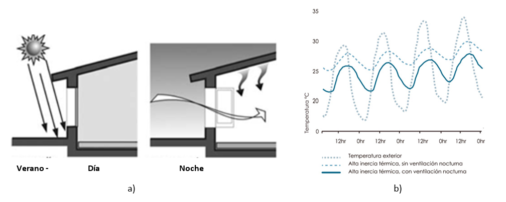 La inercia térmica se puede aprovechar de forma pasiva, a través de la ganancia solar directa e indirecta en períodos invernales, y mediante elementos de protección solar y ventilación nocturna para épocas estivales, pudiéndose maximizar su efecto con ventilación forzada para enfriar los elementos masivos, y mediante la activación térmica, utilizando conductos que refrigeren interiormente. Existen casos publicados que han logrado un ahorro energético mayor al 60% para el acondicionamiento térmico.